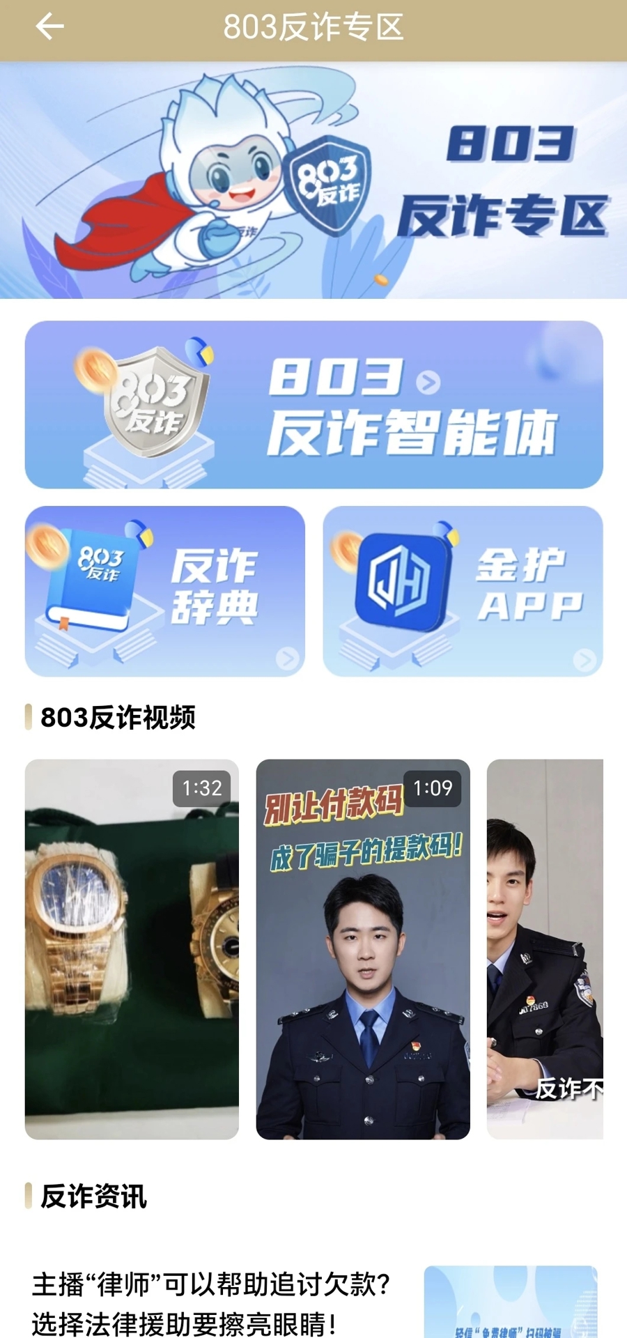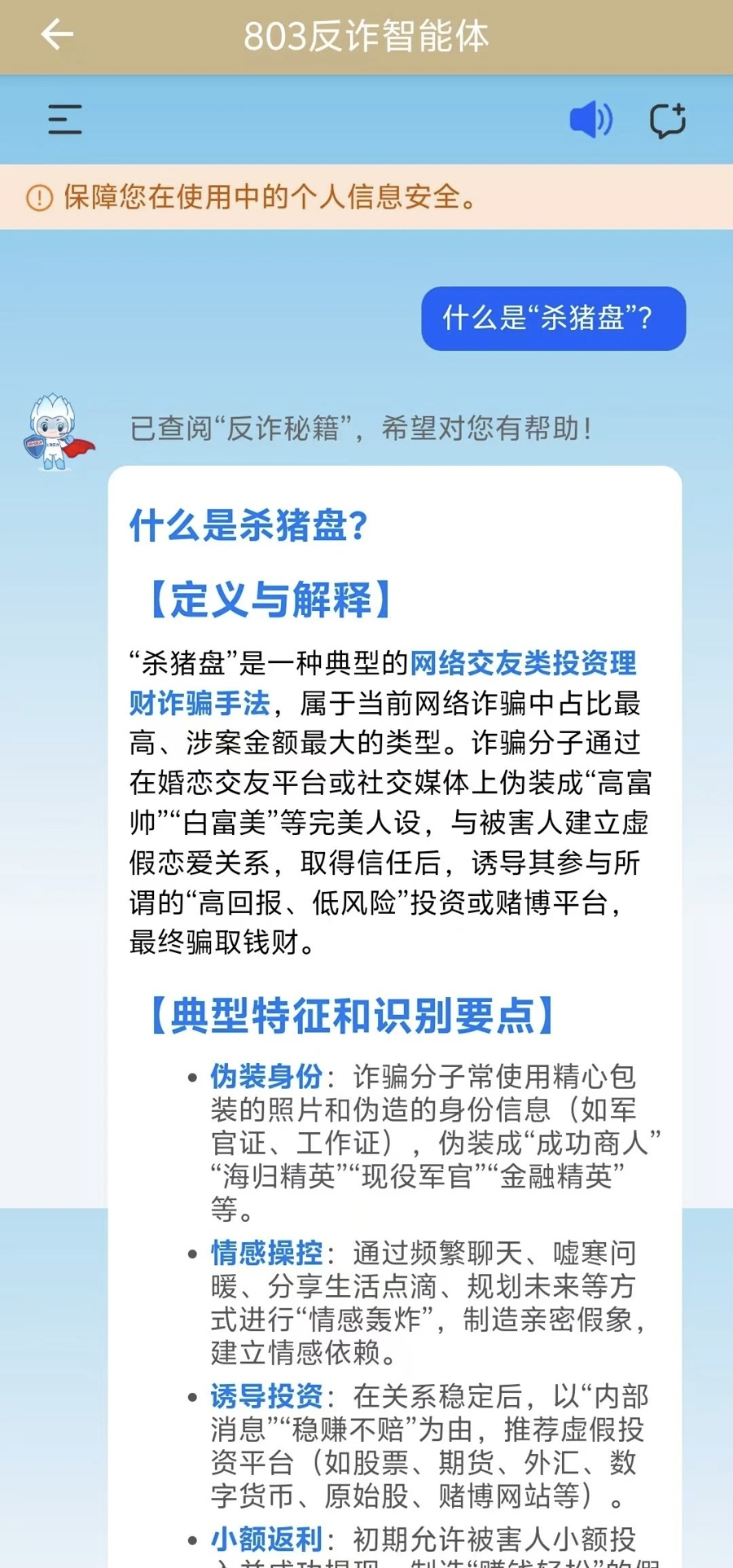 本次活动上线的“803反诈”智能体APP集反诈问答智能体、反诈资讯和反诈辞典于一体,以日常生活中的常见诈骗场景为基础,深度融合了AI大数据模型算法,可以通过“文字+语音”的形式为市民群众提供问答交互。