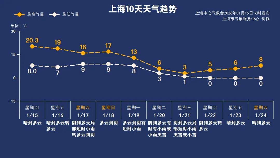 本该是小寒向大寒过渡的全年最冷时段,上海却迎来反常回暖。今天(15日)上海中心城区(徐家汇站)最高温定格20.3℃,刷新2026年以来气温新高。全市各区最高温纷纷突破20℃大关,其中浦东最暖,为21℃。