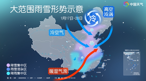 具体来看,1月18日,雨雪冰冻影响区域将略有南压,安徽、江苏等地将现雨雪天气。19日至20日,将进入本轮降雪过程核心影响时段,雨雪范围迅速扩大,长江以北部分地区降雪明显增强,江苏北部、安徽中北部可达到大雪或暴雪量级。